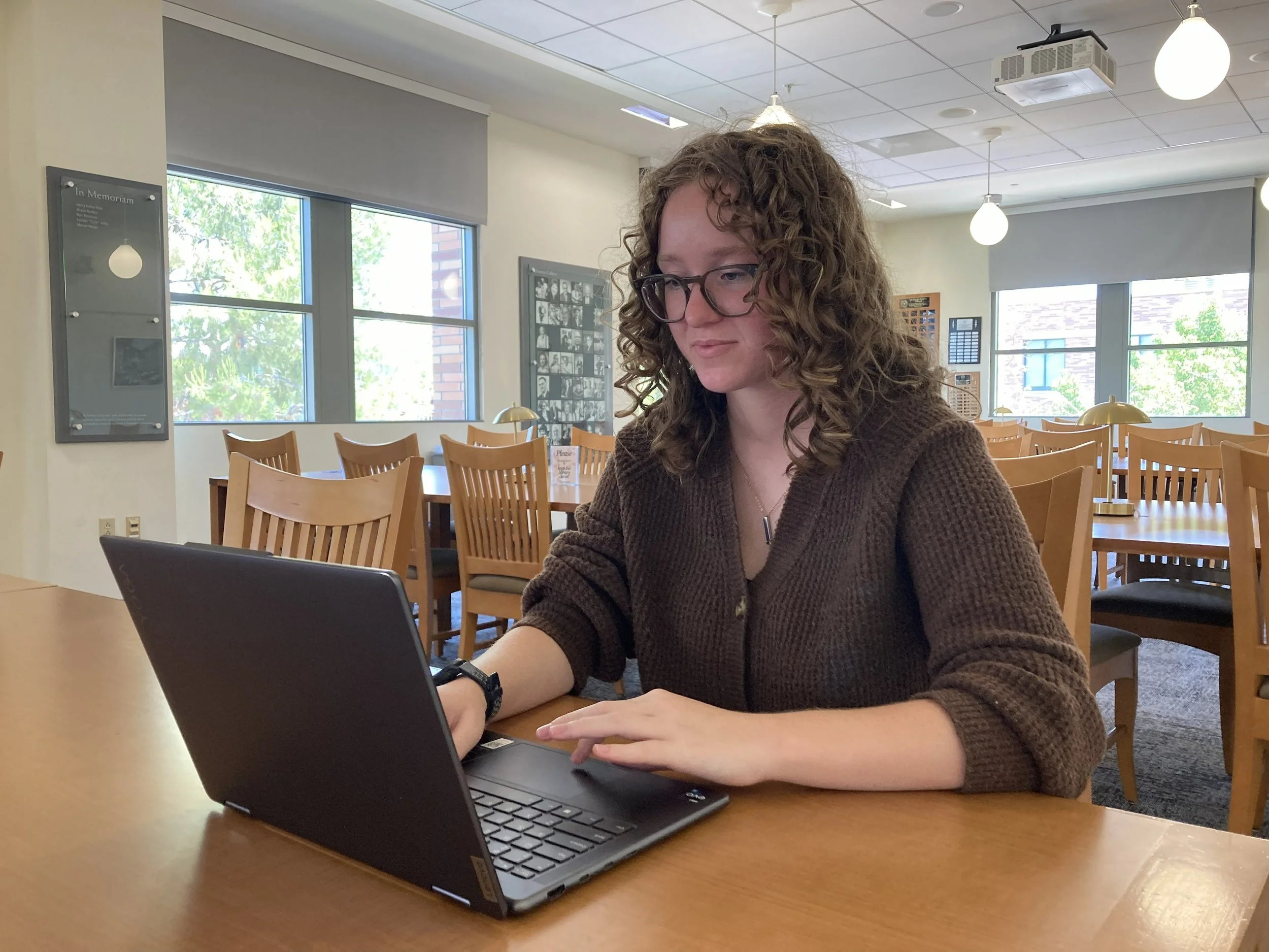 Karli Jean Lonnquist working on LAST EXIT in Leatherby Libraries at Chapman University during her Summer Undergraduate Research Fellowship